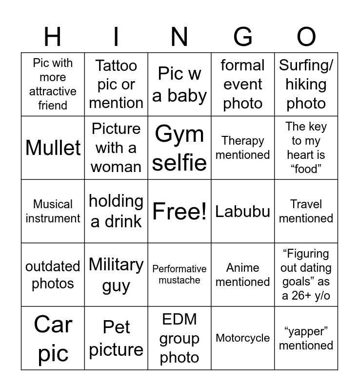 This bingo card has a free space and 24 words: Military guy, Pet picture, Gym selfie, Car pic, Surfing/ hiking photo, Pic with more attractive friend, Mullet, Tattoo pic or mention, Labubu, Performative mustache, Therapy mentioned, Musical instrument, Anime mentioned, “Figuring out dating goals” as a 26+ y/o, Picture with a woman, Motorcycle, Travel mentioned, Pic w a baby, The key to my heart is “food”, holding a drink, “yapper” mentioned, outdated photos, formal event photo and EDM group photo.