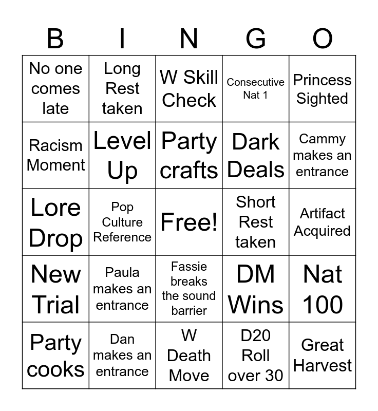 This bingo card has a free space and 24 words: Paula makes an entrance, Dan makes an entrance, Party crafts, Party cooks, Princess Sighted, No one comes late, Racism Moment, Long Rest taken, Short Rest taken, Fassie breaks the sound barrier, Dark Deals, Lore Drop, DM Wins, Nat 100, Level Up, D20 Roll over 30, Artifact Acquired, W Skill Check, Cammy makes an entrance, Pop Culture Reference, Great Harvest, New Trial, Consecutive Nat 1 and W Death Move.