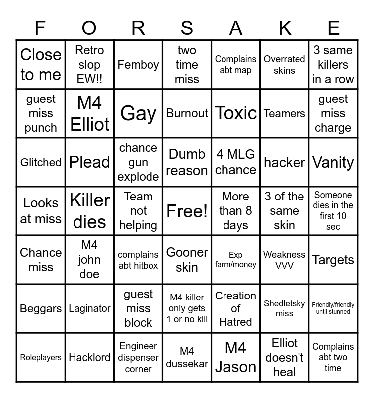 This bingo card has a free space and 48 words: Chance miss, Killer dies, Engineer dispenser corner, Gooner skin, Toxic, 3 of the same skin, 3 same killers in a row, Roleplayers, Plead, Team not helping, two time miss, Complains abt map, hacker, Vanity, Looks at miss, Laginator, Femboy, Dumb reason, Creation of Hatred, Overrated skins, guest miss charge, guest miss punch, Retro slop EW!!, Gay, M4 Jason, Teamers, Someone dies in the first 10 sec, Beggars, M4 john doe, chance gun explode, M4 killer only gets 1 or no kill, 4 MLG chance, Shedletsky miss, Friendly/friendly until stunned, Close to me, Hacklord, complains abt hitbox, M4 dussekar, More than 8 days, Elliot doesn't heal, Targets, Glitched, M4 Elliot, guest miss block, Burnout, Exp farm/money, Weakness VVV and Complains abt two time.