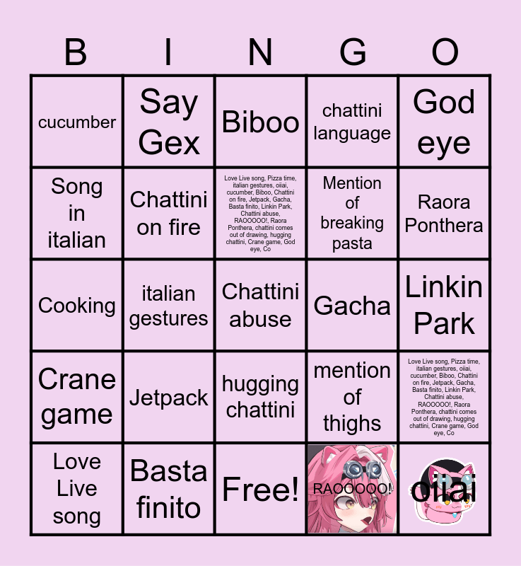 This bingo card has 2 images and 29 words: Love Live song, Pizza time, italian gestures, oiiai, cucumber, Biboo, Chattini on fire, Jetpack, Gacha, Basta finito, Linkin Park, Chattini abuse, Free!, RAOOOOO!, Raora Ponthera, chattini comes out of drawing, hugging chattini, Crane game, God eye, Cooking, mention of thighs, The beginging, Mention of breaking pasta, Song in italian, chattini language, Say Gex, Love Live song, Pizza time, italian gestures, oiiai, cucumber, Biboo, Chattini on fire, Jetpack, Gacha, Basta finito, Linkin Park, Chattini abuse, RAOOOOO!, Raora Ponthera, chattini comes out of drawing, hugging chattini, Crane game, God eye, Co, Love Live song, Pizza time, italian gestures, oiiai, cucumber, Biboo, Chattini on fire, Jetpack, Gacha, Basta finito, Linkin Park, Chattini abuse, RAOOOOO!, Raora Ponthera, chattini comes out of drawing, hugging chattini, Crane game, God eye, Co and Love Live song, Pizza time, italian gestures, oiiai, cucumber, Biboo, Chattini on fire, Jetpack, Gacha, Basta finito, Linkin Park, Chattini abuse, RAOOOOO!, Raora Ponthera, chattini comes out of drawing, hugging chattini, Crane game, God eye, Co.
