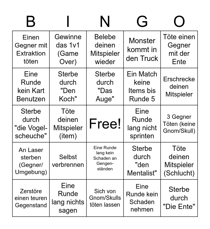 This bingo card has a free space and 24 words: Selbst verbrennen, Eine Runde lang nichts sagen, Sterbe durch "Das Auge", Zerstöre einen teuren Gegenstand, Töte einen Gegner mit der Ente, Einen Gegner mit Extraktion töten, Eine Runde kein Kart Benutzen, Gewinne das 1v1 (Game Over), Eine Runde lang nicht sprinten, Eine Runde lang kein Schaden an Gengen-ständen, Ein Match keine Items bis Runde 5, Sterbe durch "die Vogel- scheuche", Sterbe durch "den Mentalist", Töte deinen Mitspieler (Schlucht), Sterbe durch "Den Koch", Eine Runde kein Schaden nehmen, 3 Gegner Töten (keine Gnom/Skull), Belebe deinen Mitspieler wieder, Erschrecke deinen Mitspieler, Töte deinen Mitspieler (item), Sterbe durch "Die Ente", An Laser sterben (Gegner/ Umgebung), Monster kommt in den Truck and Sich von Gnom/Skulls töten lassen.