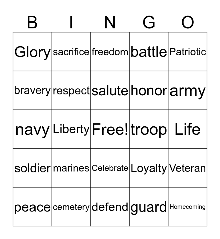 This bingo card has a free space and 28 words: Veteran, war, honor, guard, bravery, freedom, sacrifice, soldier, troop, peace, navy, battle, cemetery, defend, army, air force, marines, respect, salute, Celebrate, Glory, HERO, Homecoming, Liberty, Life, Loyalty, Patriotic and Victory.