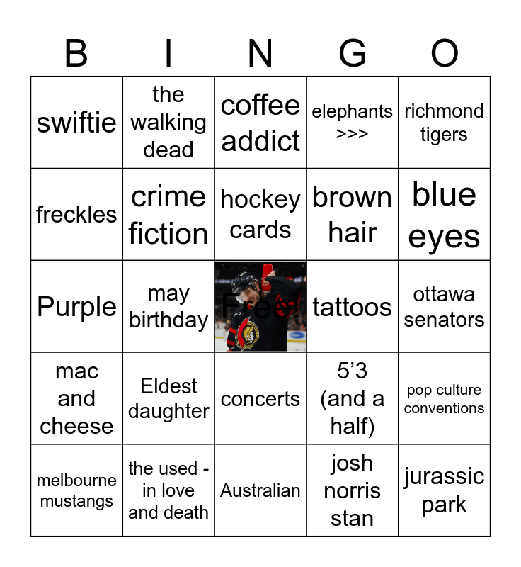 This bingo card has a free space and 24 words: Eldest daughter, the used - in love and death, hockey cards, melbourne mustangs, richmond tigers, swiftie, freckles, the walking dead, tattoos, concerts, brown hair, Purple, 5’3 (and a half), pop culture conventions, crime fiction, josh norris stan, ottawa senators, coffee addict, blue eyes, may birthday, jurassic park, mac and cheese, elephants >>> and Australian.