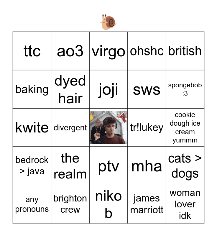 This bingo card has a free space and 24 words: the realm, brighton crew, joji, any pronouns, british, ttc, baking, ao3, tr!lukey, ptv, sws, kwite, mha, cats > dogs, dyed hair, james marriott, cookie dough ice cream yummm, virgo, spongebob :3, divergent, woman lover idk, bedrock > java, ohshc and niko b.