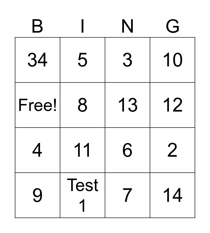 This bingo card has 16 words: Test 1, 2, 3, 34, 4, 5, 6, 7, Free!, 8, 9, 10, 11, 12, 13 and 14.