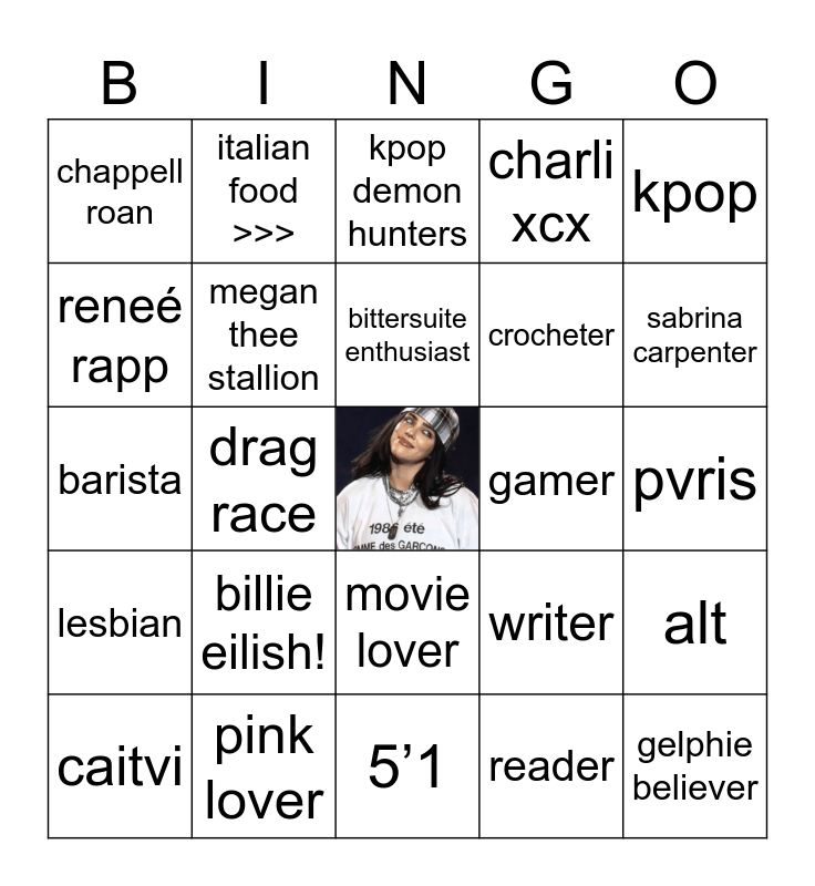 This bingo card has a free space and 24 words: billie eilish!, pink lover, bittersuite enthusiast, caitvi, kpop, chappell roan, reneé rapp, italian food >>>, gamer, movie lover, crocheter, barista, writer, alt, megan thee stallion, reader, pvris, kpop demon hunters, sabrina carpenter, drag race, gelphie believer, lesbian, charli xcx and 5’1.