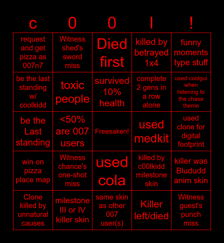 This bingo card has a free space and 24 words: Witness chance's one-shot miss, milestone III or IV killer skin, survived 10% health, Clone killed by unnatural causes, funny moments type stuff, request and get pizza as 007n7, be the last standing w/ coolkidd, Witness shed's sword miss, used medkit, used cola, complete 2 gens in a row alone, be the Last standing, killed by c00lkidd milestone skin, killer was Blududd anim skin, toxic people, Killer left/died, used clone for digital footprint, Died first, used coolgui when listening to the chase theme, <50% are 007 users, Witness guest's punch miss, win on pizza place map, killed by betrayed 1x4 and same skin as other 007 user(s).
