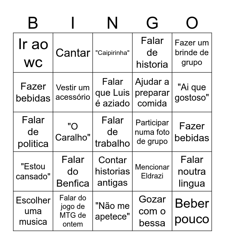 This bingo card has a free space and 24 words: Falar do Benfica, Falar do jogo de MTG de ontem, Falar que Luis é aziado, Escolher uma musica, Fazer um brinde de grupo, Ir ao wc, Fazer bebidas, Cantar, Participar numa foto de grupo, Contar historias antigas, Ajudar a preparar comida, Falar de politica, Mencionar Eldrazi, Falar noutra lingua, Vestir um acessório, Gozar com o bessa, Fazer bebidas, "Caipirinha", "Ai que gostoso", "O Caralho", Beber pouco, "Estou cansado", Falar de historia and "Não me apetece".