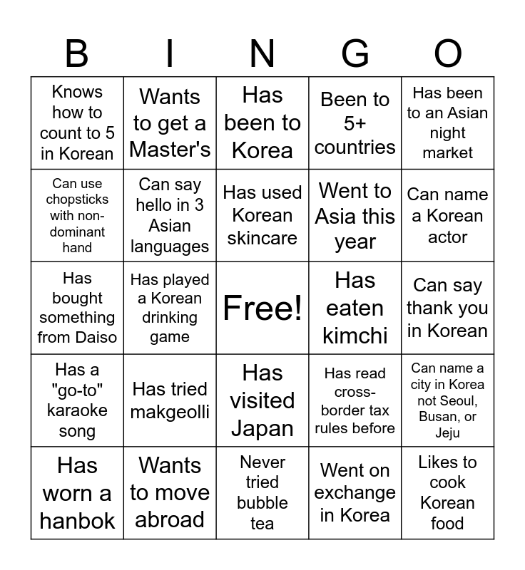 This bingo card has a free space and 24 words: Has tried makgeolli, Wants to move abroad, Has used Korean skincare, Has worn a hanbok, Has been to an Asian night market, Knows how to count to 5 in Korean, Can use chopsticks with non-dominant hand, Wants to get a Master's, Has eaten kimchi, Has visited Japan, Went to Asia this year, Has bought something from Daiso, Has read cross-border tax rules before, Can name a city in Korea not Seoul, Busan, or Jeju, Can say hello in 3 Asian languages, Went on exchange in Korea, Can say thank you in Korean, Has been to Korea, Can name a Korean actor, Has played a Korean drinking game, Likes to cook Korean food, Has a "go-to" karaoke song, Been to 5+ countries and Never tried bubble tea.