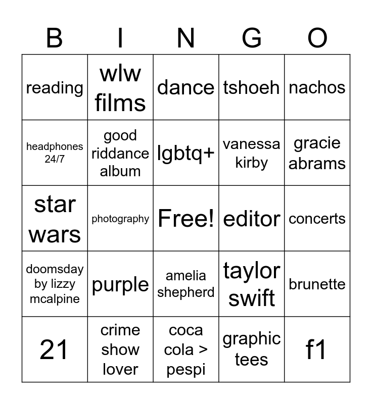 This bingo card has a free space and 24 words: purple, crime show lover, lgbtq+, 21, nachos, reading, headphones 24/7, wlw films, editor, amelia shepherd, vanessa kirby, star wars, taylor swift, brunette, good riddance album, graphic tees, concerts, dance, gracie abrams, photography, f1, doomsday by lizzy mcalpine, tshoeh and coca cola > pespi.