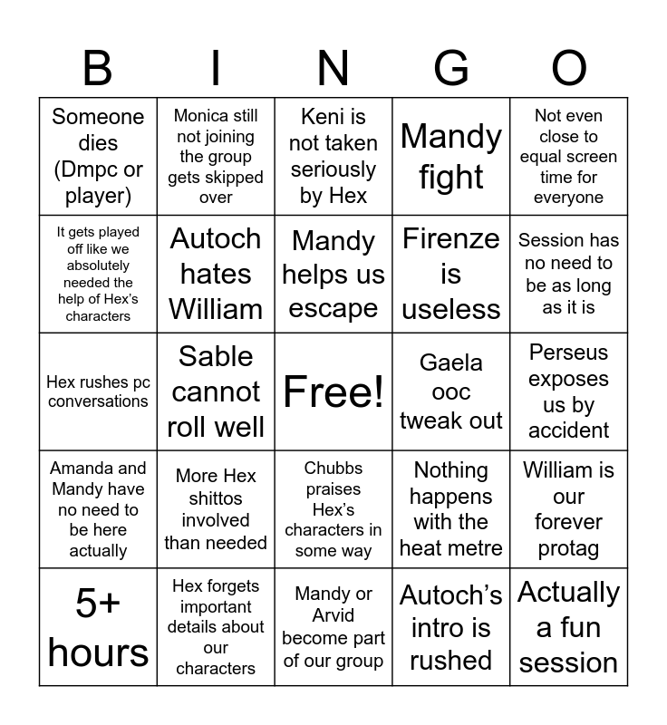 This bingo card has a free space and 24 words: More Hex shittos involved than needed, Hex forgets important details about our characters, Mandy helps us escape, 5+ hours, Not even close to equal screen time for everyone, Someone dies (Dmpc or player), It gets played off like we absolutely needed the help of Hex’s characters, Monica still not joining the group gets skipped over, Gaela ooc tweak out, Chubbs praises Hex’s characters in some way, Firenze is useless, Hex rushes pc conversations, Nothing happens with the heat metre, William is our forever protag, Autoch hates William, Autoch’s intro is rushed, Perseus exposes us by accident, Keni is not taken seriously by Hex, Session has no need to be as long as it is, Sable cannot roll well, Actually a fun session, Amanda and Mandy have no need to be here actually, Mandy fight and Mandy or Arvid become part of our group.