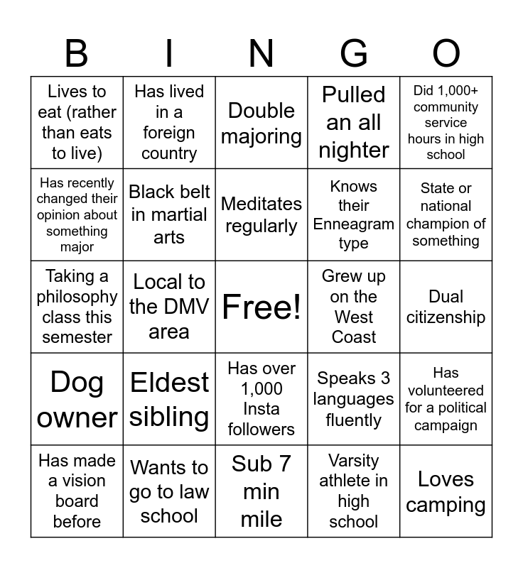 This bingo card has a free space and 24 words: Eldest sibling, Wants to go to law school, Meditates regularly, Has made a vision board before, Did 1,000+ community service hours in high school, Lives to eat (rather than eats to live), Has recently changed their opinion about something major, Has lived in a foreign country, Grew up on the West Coast, Has over 1,000 Insta followers, Knows their Enneagram type, Taking a philosophy class this semester, Speaks 3 languages fluently, Has volunteered for a political campaign, Black belt in martial arts, Varsity athlete in high school, Dual citizenship, Double majoring, State or national champion of something, Local to the DMV area, Loves camping, Dog owner, Pulled an all nighter and Sub 7 min mile.