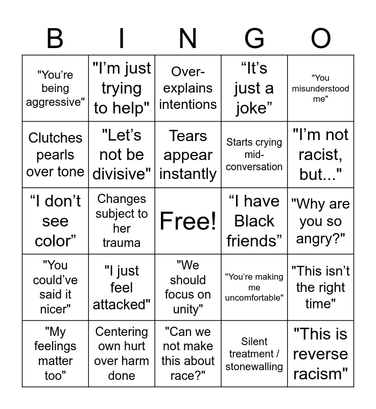 This bingo card has a free space and 25 words: "I just feel attacked", "Can we not make this about race?", Tears appear instantly, "My feelings matter too", "You misunderstood me", "You’re being aggressive", Clutches pearls over tone, "I’m just trying to help", “I have Black friends”, "We should focus on unity", Starts crying mid-conversation, “I don’t see color”, "You’re making me uncomfortable", "This isn’t the right time", "Let’s not be divisive", "I’m feeling unsafe", "Why are you so angry?", Over-explains intentions, "I’m not racist, but...", Changes subject to her trauma, "This is reverse racism", Centering own hurt over harm done, "You could’ve said it nicer", “It’s just a joke” and Silent treatment / stonewalling.