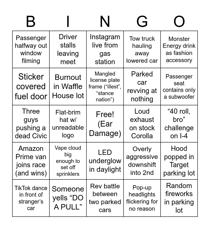 This bingo card has a free space and 24 words: Vape cloud big enough to set off sprinklers, Someone yells “DO A PULL”, Mangled license plate frame (“illest”, “stance nation”), TikTok dance in front of stranger’s car, Monster Energy drink as fashion accessory, Passenger halfway out window filming, Sticker covered fuel door, Driver stalls leaving meet, Loud exhaust on stock Corolla, LED underglow in daylight, Parked car revving at nothing, Three guys pushing a dead Civic, Overly aggressive downshift into 2nd, Hood popped in Target parking lot, Burnout in Waffle House lot, Pop-up headlights flickering for no reason, “40 roll, bro” challenge on I-4, Instagram live from gas station, Passenger seat contains only a subwoofer, Flat-brim hat w/ unreadable logo, Random fireworks in parking lot, Amazon Prime van joins race (and wins), Tow truck hauling away lowered car and Rev battle between two parked cars.