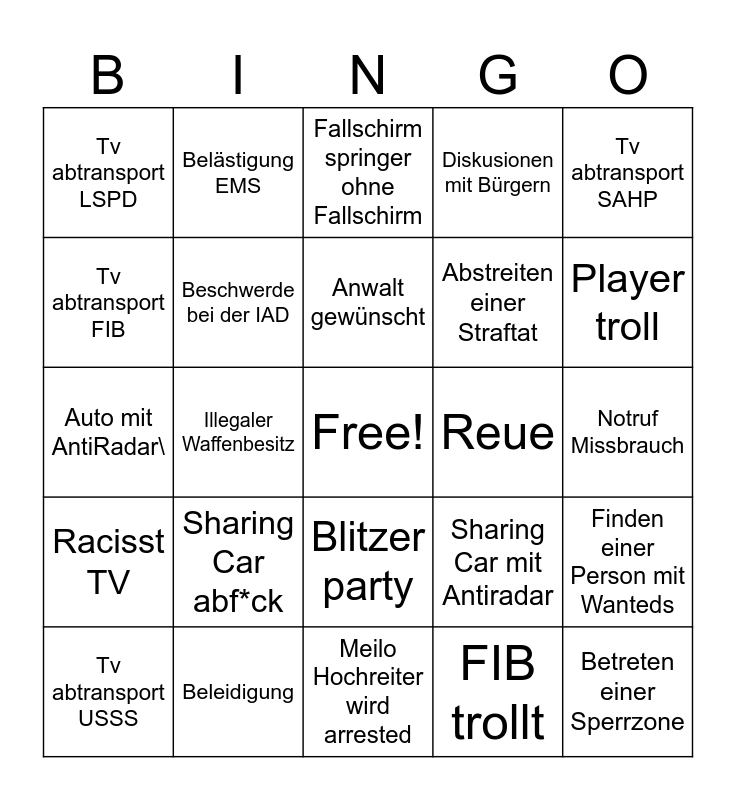 This bingo card has a free space and 24 words: Sharing Car abf*ck, Beleidigung, Anwalt gewünscht, Tv abtransport USSS, Tv abtransport SAHP, Tv abtransport LSPD, Tv abtransport FIB, Belästigung EMS, Reue, Blitzer party, Abstreiten einer Straftat, Auto mit AntiRadar\, Sharing Car mit Antiradar, Finden einer Person mit Wanteds, Beschwerde bei der IAD, FIB trollt, Notruf Missbrauch, Fallschirm springer ohne Fallschirm, Player troll, Illegaler Waffenbesitz, Betreten einer Sperrzone, Racisst TV, Diskusionen mit Bürgern and Meilo Hochreiter wird arrested.