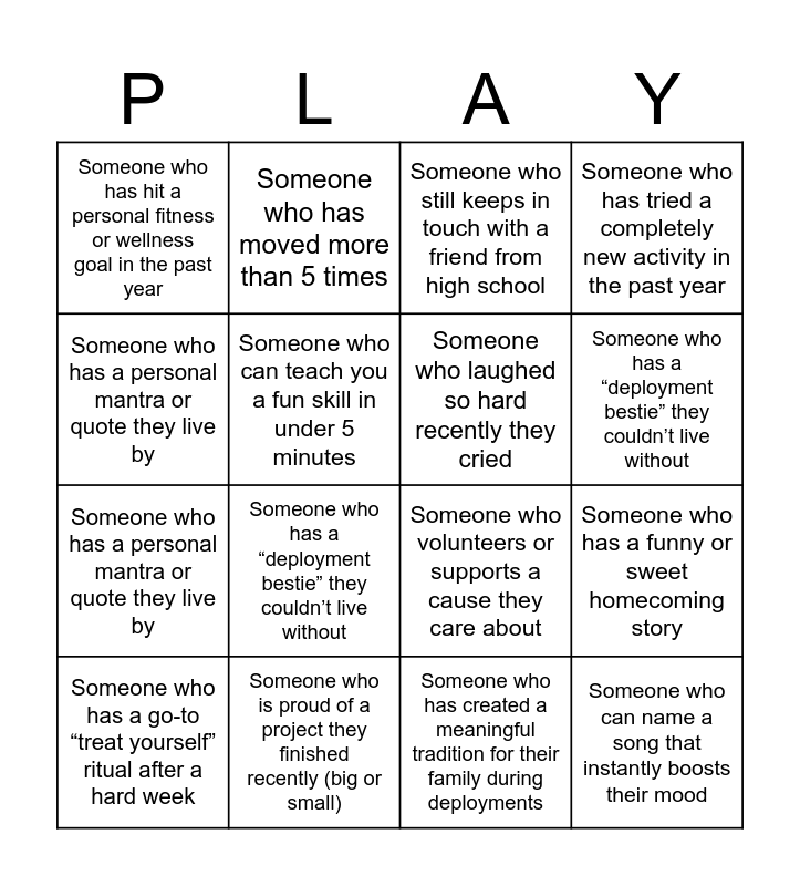 ⚠ This card has duplicate items: Someone who can name a song that instantly boosts their mood (2), Someone who has a go-to “treat yourself” ritual after a hard week (2), Someone who laughed so hard recently they cried (2), Someone who gets so into a hobby they lose track of time (2), Someone who has tried a completely new activity in the past year (2), Someone who can teach you a fun skill in under 5 minutes (2), Someone who still keeps in touch with a friend from high school (2), Someone who has a “deployment bestie” they couldn’t live without (2), Someone who has hosted (or attended) a legendary military spouse get-together (2), Someone who volunteers or supports a cause they care about (2), Someone who has a personal mantra or quote they live by (2), Someone who has created a meaningful tradition for their family during deployments (2), Someone who recently learned something completely new (2), Someone who has hit a personal fitness or wellness goal in the past year (2), Someone who is proud of a project they finished recently (big or small) (2), Someone who has moved more than 5 times (2), Someone who has a funny or sweet homecoming story (2)