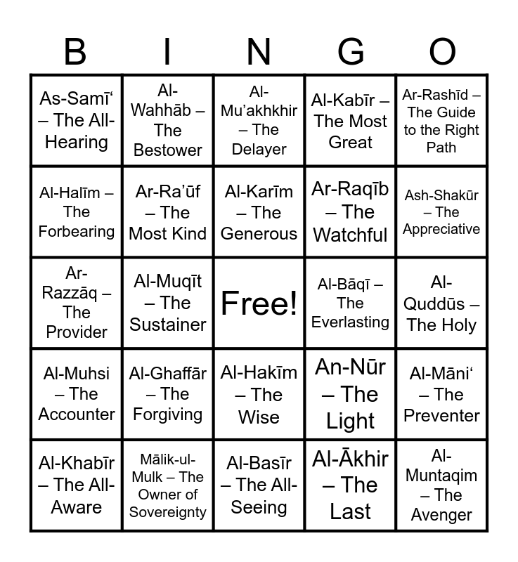 This bingo card has a free space and 98 words: Ar-Rahmān – The Beneficent, Ar-Rahīm – The Merciful, Al-Malik – The King, Al-Quddūs – The Holy, As-Salām – The Source of Peace, Al-Mu’min – The Giver of Security, Al-Muhaymin – The Protector, Al-‘Azīz – The Mighty, Al-Jabbār – The Compeller, Al-Mutakabbir – The Majestic, Al-Khāliq – The Creator, Al-Bāri’ – The Evolver, Al-Musawwir – The Fashioner, Al-Ghaffār – The Forgiving, Al-Qahhār – The Subduer, Al-Wahhāb – The Bestower, Ar-Razzāq – The Provider, Al-Fattāh – The Opener, Al-‘Alīm – The All-Knowing, Al-Qābid – The Withholder, Al-Bāsit – The Expander, Al-Khāfid – The Abaser, Ar-Rāfi‘ – The Exalter, Al-Mu‘izz – The Honourer, Al-Mudhill – The Dishonourer, As-Samī‘ – The All-Hearing, Al-Basīr – The All-Seeing, Al-Hakam – The Judge, Al-‘Adl – The Just, Al-Latīf – The Subtle One, Al-Khabīr – The All-Aware, Al-Halīm – The Forbearing, Al-‘Azīm – The Magnificent, Al-Ghafūr – The Forgiving, Ash-Shakūr – The Appreciative, Al-‘Aliyy – The Most High, Al-Kabīr – The Most Great, Al-Hafīz – The Preserver, Al-Muqīt – The Sustainer, Al-Hasīb – The Reckoner, Al-Jalīl – The Majestic, Al-Karīm – The Generous, Ar-Raqīb – The Watchful, Al-Mujīb – The Responsive, Al-Wāsi‘ – The All-Encompassing, Al-Hakīm – The Wise, Al-Wadūd – The Loving, Al-Majīd – The Glorious, Al-Bā‘ith – The Resurrector, Ash-Shahīd – The Witness, Al-Haqq – The Truth, Al-Wakīl – The Trustee, Al-Qawiyy – The Strong, Al-Matīn – The Firm, Al-Waliyy – The Protecting Friend, Al-Hamīd – The Praiseworthy, Al-Muhsi – The Accounter, Al-Mubdi’ – The Originator, Al-Mu‘īd – The Restorer, Al-Muhyī – The Giver of Life, Al-Mumīt – The Taker of Life, Al-Hayy – The Ever-Living, Al-Qayyūm – The Sustainer, Al-Wājid – The Finder, Al-Mājid – The Noble, Al-Wāhid – The One, As-Samad – The Eternal, Al-Qādir – The Able, Al-Muqtadir – The Powerful, Al-Muqaddim – The Expediter, Al-Mu’akhkhir – The Delayer, Al-Awwal – The First, Al-Ākhir – The Last, Az-Zāhir – The Manifest, Al-Bātin – The Hidden, Al-Wālī – The Governor, Al-Muta‘ālī – The Exalted, Al-Barr – The Source of All Goodness, At-Tawwāb – The Accepter of Repentance, Al-Muntaqim – The Avenger, Al-‘Afuww – The Pardoner, Ar-Ra’ūf – The Most Kind, Mālik-ul-Mulk – The Owner of Sovereignty, Dhul-Jalāli wal-Ikrām – Lord of Majesty and Generosity, Al-Muqsiṭ – The Equitable, Al-Jāmi‘ – The Gatherer, Al-Ghaniyy – The Self-Sufficient, Al-Mughnī – The Enricher, Al-Māni‘ – The Preventer, Ad-Dārr – The Distresser, An-Nāfi‘ – The Benefactor, An-Nūr – The Light, Al-Hādī – The Guide, Al-Badī‘ – The Incomparable, Al-Bāqī – The Everlasting, Al-Wārith – The Inheritor, Ar-Rashīd – The Guide to the Right Path and As-Sabūr – The Patient.