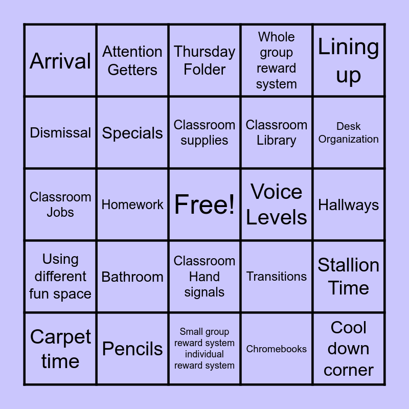This bingo card has a free space and 24 words: Bathroom, Pencils, Classroom supplies, Carpet time, Lining up, Arrival, Dismissal, Attention Getters, Voice Levels, Classroom Hand signals, Classroom Library, Classroom Jobs, Transitions, Stallion Time, Specials, Chromebooks, Hallways, Thursday Folder, Desk Organization, Homework, Cool down corner, Using different fun space, Whole group reward system and Small group reward system individual reward system.