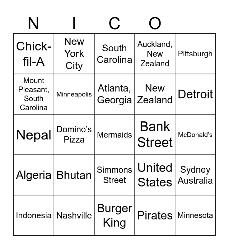 This bingo card has 30 words: Nashville, Charlotte, Domino’s Pizza, Pizza Hut, Chick-fil-A, South Carolina, Minneapolis, Simmons Street, Bank Street, Burger King, McDonald’s, Mermaids, Pirates, Minnesota, Detroit, Myrtle Beach airport, United States, Algeria, Bhutan, Pittsburgh, Nepal, Australia, New York City, New Zealand, Mount Pleasant, South Carolina, Auckland, New Zealand, Sydney Australia, Indonesia, Atlanta, Georgia and Popeyes.