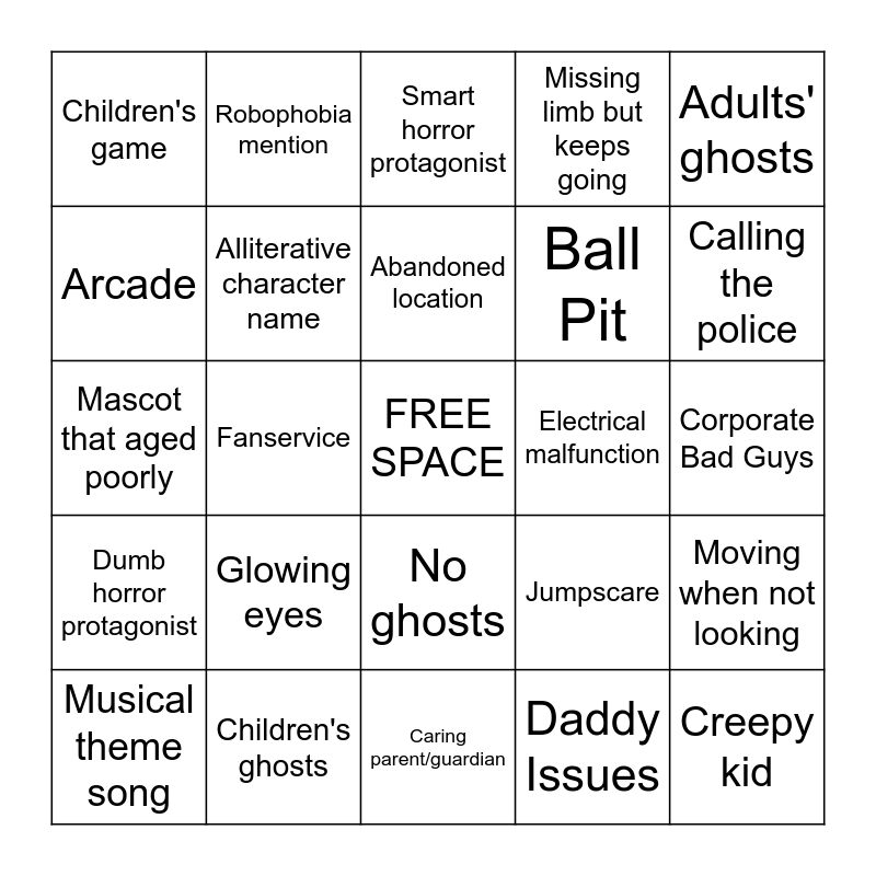 This bingo card has a free space and 26 words: No ghosts, Daddy Issues, Abandoned location, Children's ghosts, Adults' ghosts, Children's game, Arcade, Robophobia mention, Corporate Bad Guys, Jumpscare, Ball Pit, Mascot that aged poorly, Moving when not looking, Musical theme song, Fanservice, Body horror, Missing limb but keeps going, Dumb horror protagonist, Smart horror protagonist, Creepy kid, Calling the police, Caring parent/guardian, Electrical malfunction, Glowing eyes, Alliterative character name and Pizza.