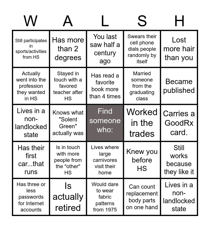 This bingo card has a free space and 24 words: Is in touch with more people from the "other" HS, Is actually retired, Has read a favorite book more than 4 times, Has three or less passwords for Internet accounts, Lost more hair than you, Still participates in sports/activities from HS, Actually went into the profession they wanted in HS, Has more than 2 degrees, Worked in the trades, Lives where large carnivores visit their home, Married someone from the graduating class, Lives in a non-landlocked state, Knew you before HS, Still works because they like it, Stayed in touch with a favored teacher after HS, Can count replacement body parts on one hand, Carries a GoodRx card., You last saw half a century ago, Became published, Knows what "Solent Green" actually was, Lives in a non-landlocked state, Has their first car...that runs, Swears their cell phone dials people randomly by itself and Would dare to wear fabric patterns from 1975.