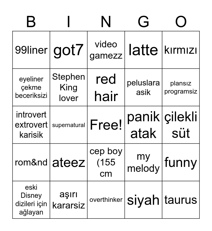This bingo card has a free space and 24 words: ateez, aşırı kararsiz, red hair, eski Disney dizileri için ağlayan, kırmızı, 99liner, eyeliner çekme beceriksizi, got7, panik atak, cep boy (155 cm, peluslara asik, introvert extrovert karisik, my melody, funny, Stephen King lover, siyah, çilekli süt, video gamezz, plansız programsiz, supernatural, taurus, rom&nd, latte and overthinker.
