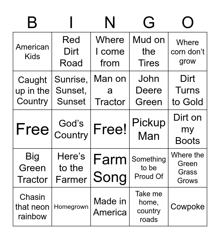 This bingo card has a free space and 38 words: International Harvester, Amarillo Sky, Fly Over States, Sunrise, Sunset, Sunset, Where the Green Grass Grows, Here’s to the Farmer, Man on a Tractor, Down on the Farm, Where corn don’t grow, John Deere Green, God’s Country, Mud on the Tires, Cowpoke, Dirt on my Boots, Caught up in the Country, Big Green Tractor, Dirt Road Anthem, Where I come from, Fishin’ in the Dark, Pickup Man, American Kids, Homegrown, Dirt Turns to Gold, Chasin that neon rainbow, How country feels, Made in America, Mountain Music, Boot Scootin’ Boogie, Harvest Time, Dear Rodeo, Welcome to the Show, Farm Song, Take me home, country roads, Red Dirt Road, Should’ve been a Cowboy, Something to be Proud Of, Free and Broken Window Serenade.