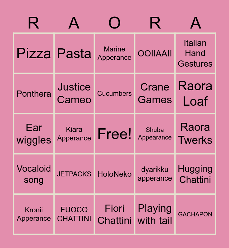 This bingo card has a free space and 24 words: Kronii Apperance, JETPACKS, Cucumbers, Playing with tail, Italian Hand Gestures, Pizza, Pasta, Marine Apperance, Shuba Appearance, Raora Twerks, Ear wiggles, Justice Cameo, dyarikku apperance, Hugging Chattini, Ponthera, FUOCO CHATTINI, Fiori Chattini, OOIIAAII, Raora Loaf, Vocaloid song, Kiara Apperance, HoloNeko, Crane Games and GACHAPON.