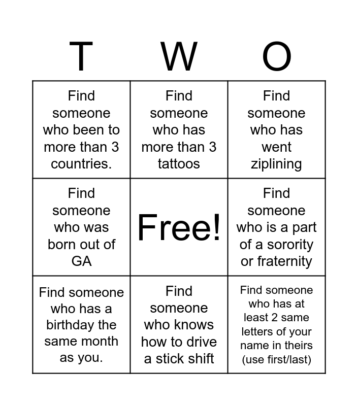 This bingo card has a free space and 8 words: Find someone who was born out of GA, Find someone who has more than 3 tattoos, Find someone who is a part of a sorority or fraternity, Find someone who has a birthday the same month as you., Find someone who has went ziplining, Find someone who been to more than 3 countries., Find someone who knows how to drive a stick shift and Find someone who has at least 2 same letters of your name in theirs (use first/last).