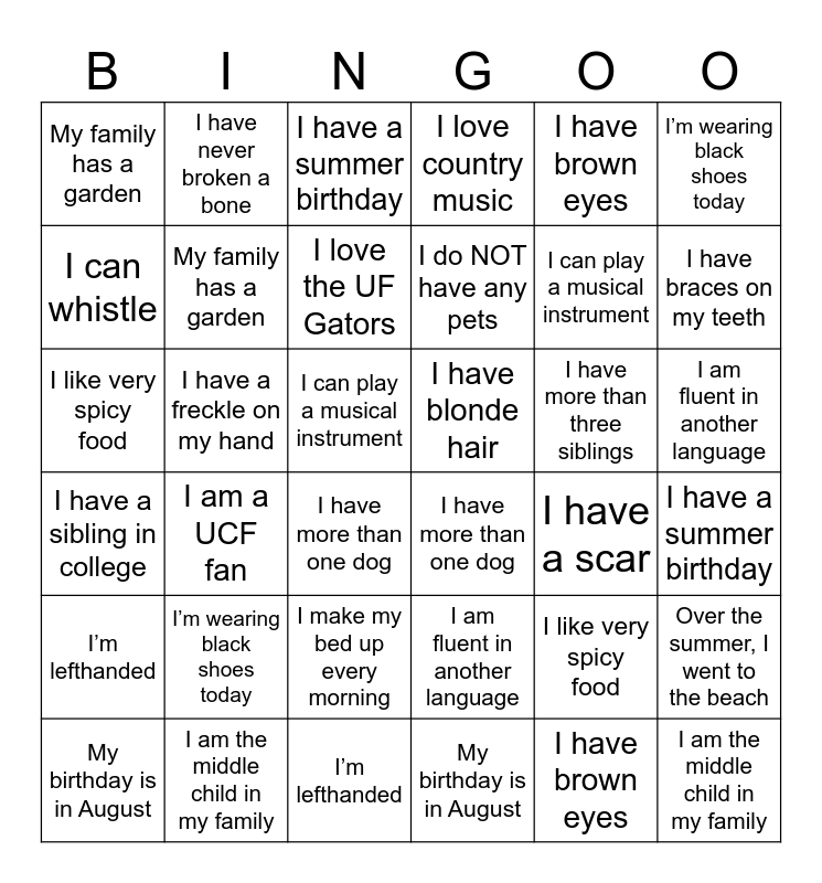⚠ This card has duplicate items: My birthday is in August (2), I have a summer birthday (2), My middle name begins with a K (2), I have never had a cavity (2), I play a sport (2), I am the middle child in my family (2), I have a scar (2), I have more than one dog (2), I’m the oldest in my family (2), I make my bed up every morning (2), I traveled to another state over the summer (2), My family has a garden (2), I’m wearing black shoes today (2), I have more than three siblings (2), I have braces on my teeth (2), I’m lefthanded (2), I do NOT have any pets (2), I have been to Europe (2), I can play a musical instrument (2), I can whistle (2), I have never broken a bone (2), I love country music (2), I am fluent in another language (2), I like very spicy food (2), I like FSU (2), I am a UCF fan (2), I love the UF Gators (2), I have a sibling in the 8th grade at TCS (2), I have blonde hair (2), I have brown eyes (2), I have a freckle on my hand (2), Over the summer, I went to the beach (2), I like to eat sushi (2)
