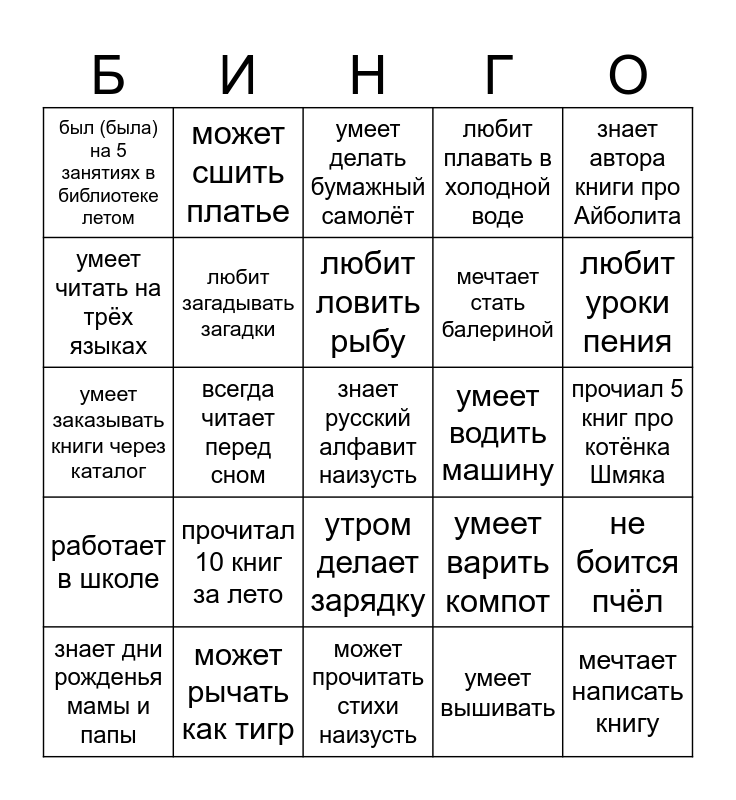 This bingo card has a free space and 24 words: прочитал 10 книг за лето, может рычать как тигр, любит ловить рыбу, знает дни рожденья мамы и папы, знает автора книги про Айболита, был (была) на 5 занятиях в библиотеке летом, умеет читать на трёх языках, может сшить платье, умеет водить машину, утром делает зарядку, мечтает стать балериной, умеет заказывать книги через каталог, умеет варить компот, не боится пчёл, любит загадывать загадки, умеет вышивать, прочиал 5 книг про котёнка Шмяка, умеет делать бумажный самолёт, любит уроки пения, всегда читает перед сном, мечтает написать книгу, работает в школе, любит плавать в холодной воде and может прочитать стихи наизусть.