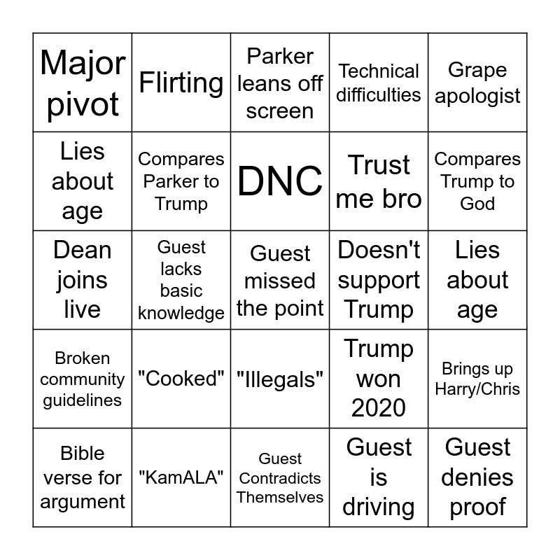 This bingo card has a free space and 24 words: "Cooked", "KamALA", DNC, Bible verse for argument, Grape apologist, Major pivot, Lies about age, Flirting, Doesn't support Trump, "Illegals", Trust me bro, Dean joins live, Trump won 2020, Brings up Harry/Chris, Compares Parker to Trump, Guest is driving, Lies about age, Parker leans off screen, Compares Trump to God, Guest lacks basic knowledge, Guest denies proof, Broken community guidelines, Technical difficulties and Guest Contradicts Themselves.
