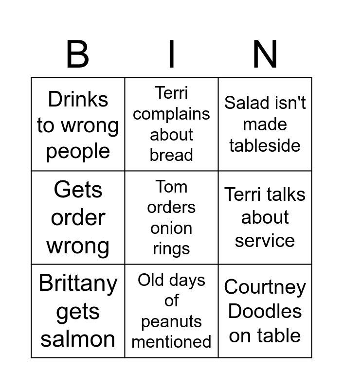 This bingo card has 9 words: Brittany gets salmon, Salad isn't made tableside, Terri complains about bread, Gets order wrong, Drinks to wrong people, Terri talks about service, Tom orders onion rings, Courtney Doodles on table and Old days of peanuts mentioned.