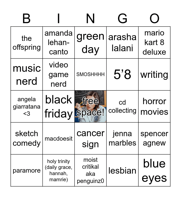 This bingo card has a free space and 24 words: macdoesit, holy trinity (daily grace, hannah, mamrie), SMOSHHHH, paramore, mario kart 8 deluxe, the offspring, music nerd, amanda lehan-canto, cd collecting, cancer sign, 5’8, angela giarratana <3, jenna marbles, spencer agnew, video game nerd, lesbian, horror movies, green day, writing, black friday, blue eyes, sketch comedy, arasha lalani and moist critikal aka penguinz0.