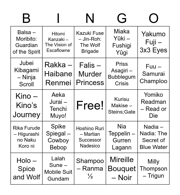 This bingo card has a free space and 25 words: Spike Spiegal – Cowboy Bebop, Shampoo – Ranma ½, Falis – Murder Princess, Holo – Spice and Wolf, Yakumo Fuji – 3x3 Eyes, Balsa – Moribito: Guardian of the Spirit, Jubei Kibagami – Ninja Scroll, Hitomi Kanzaki – The Vision of Escaflowne, Kurisu Makise – Steins;Gate, Hoshino Ruri – Martian Successor Nadesico, Priss Asagiri – Bubblegum Crisis, Kino – Kino’s Journey, Nia Teppelin – Gurren Lagann, Nadia – Nadia: The Secret of Blue Water, Rakka – Haibane Renmei, Hilda – Outlaw Star, Yomiko Readman – Read or Die, Kazuki Fuse – Jin-Roh: The Wolf Brigade, Fuu – Samurai Champloo, Aeka Jurai – Tenchi Muyo!, Milly Thompson – Trigun, Lalah Sune – Mobile Suit Gundam, Rika Furude – Higurashi no Naku Koro ni, Miaka Yūki – Fushigi Yûgi and Mireille Bouquet – Noir.