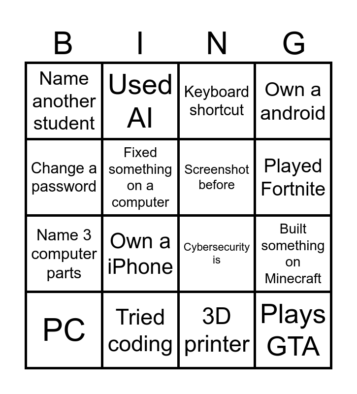 This bingo card has 16 words: Tried coding, Built something on Minecraft, Keyboard shortcut, Name another student, Name 3 computer parts, Used AI, Cybersecurity is, 3D printer, Change a password, Fixed something on a computer, PC, Own a android, Own a iPhone, Played Fortnite, Screenshot before and Plays GTA.