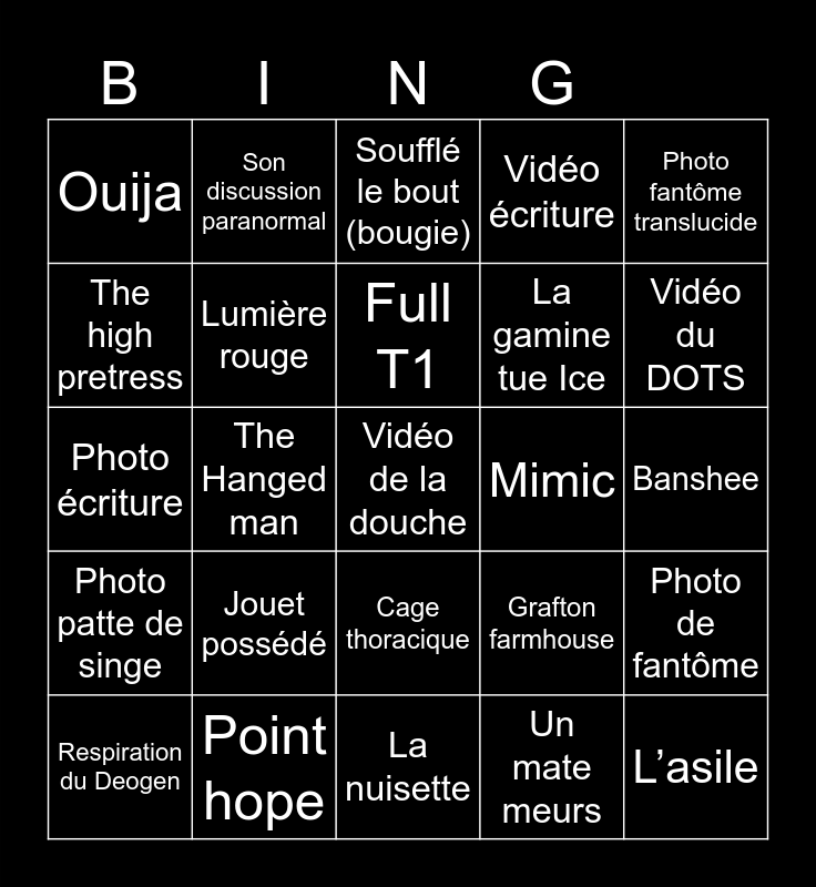 This bingo card has 25 words: Jouet possédé, La nuisette, Full T1, Respiration du Deogen, Photo fantôme translucide, Ouija, The high pretress, Son discussion paranormal, Mimic, Cage thoracique, La gamine tue Ice, Photo écriture, Grafton farmhouse, Photo de fantôme, Lumière rouge, L’asile, Banshee, Soufflé le bout (bougie), Vidéo du DOTS, The Hanged man, Vidéo de la douche, Point hope, Photo patte de singe, Vidéo écriture and Un mate meurs.