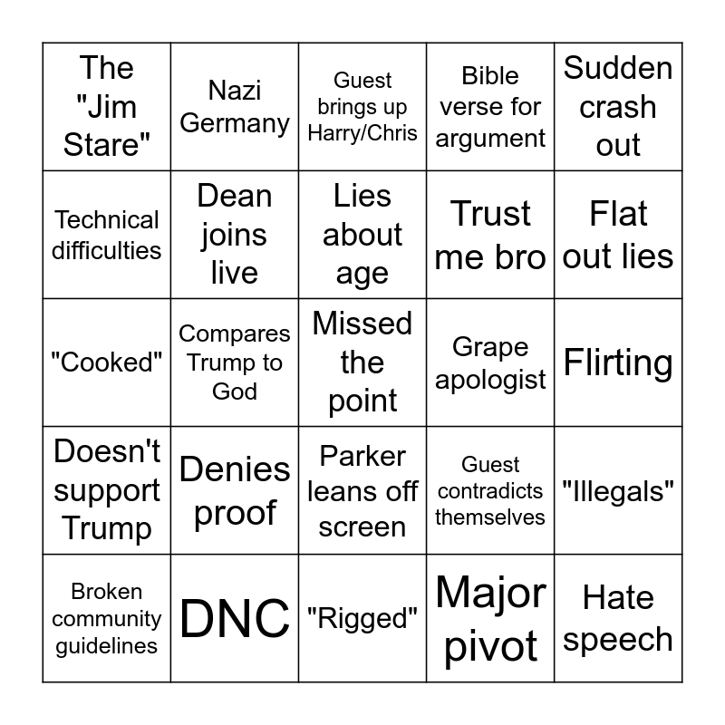 This bingo card has a free space and 24 words: Denies proof, DNC, Lies about age, Broken community guidelines, Sudden crash out, The "Jim Stare", Technical difficulties, Nazi Germany, Grape apologist, Parker leans off screen, Trust me bro, "Cooked", Guest contradicts themselves, "Illegals", Dean joins live, Major pivot, Flirting, Guest brings up Harry/Chris, Flat out lies, Compares Trump to God, Hate speech, Doesn't support Trump, Bible verse for argument and "Rigged".