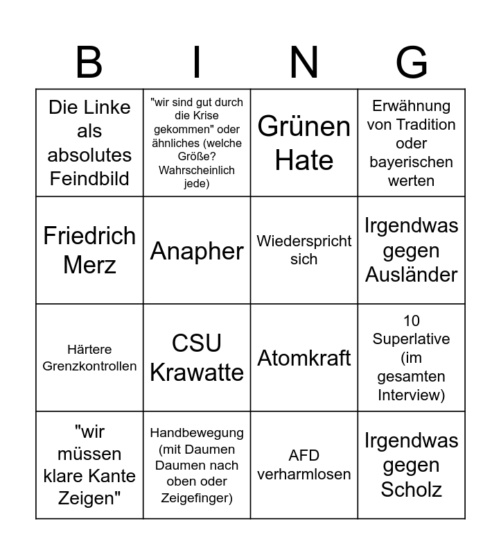 This bingo card has 19 words: Atomkraft, Bayern>Deutschland, Grünen Hate, Irgendwas gegen Scholz, 10 Superlative (im gesamten Interview), Friedrich Merz, AFD verharmlosen, Die Linke als absolutes Feindbild, "wir sind gut durch die Krise gekommen" oder ähnliches (welche Größe? Wahrscheinlich jede), Härtere Grenzkontrollen, CSU Krawatte, Anapher, Wiederspricht sich, Handbewegung (mit Daumen Daumen nach oben oder Zeigefinger), "wir müssen klare Kante Zeigen", Erwähnung von Tradition oder bayerischen werten, Erwähnung von Tradition oder bayerischen werten, Irgendwas gegen Ausländer and CSU Krawatte.