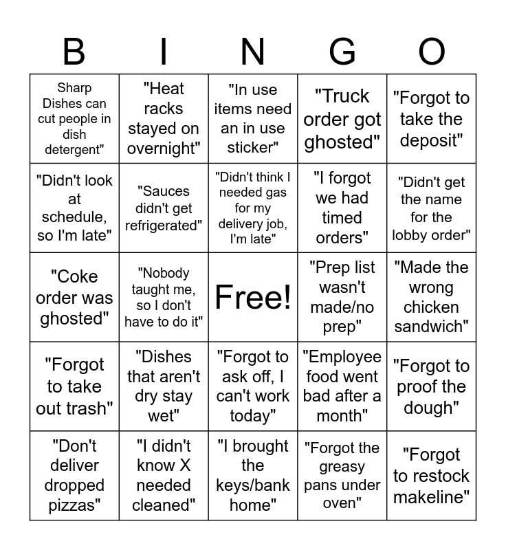 This bingo card has a free space and 24 words: "Dishes that aren't dry stay wet", "I didn't know X needed cleaned", "Didn't think I needed gas for my delivery job, I'm late", "Don't deliver dropped pizzas", "Forgot to take the deposit", Sharp Dishes can cut people in dish detergent", "Didn't look at schedule, so I'm late", "Heat racks stayed on overnight", "Prep list wasn't made/no prep", "Forgot to ask off, I can't work today", "I forgot we had timed orders", "Coke order was ghosted", "Employee food went bad after a month", "Forgot to proof the dough", "Sauces didn't get refrigerated", "Forgot the greasy pans under oven", "Made the wrong chicken sandwich", "In use items need an in use sticker", "Didn't get the name for the lobby order", "Nobody taught me, so I don't have to do it", "Forgot to restock makeline", "Forgot to take out trash", "Truck order got ghosted" and "I brought the keys/bank home".
