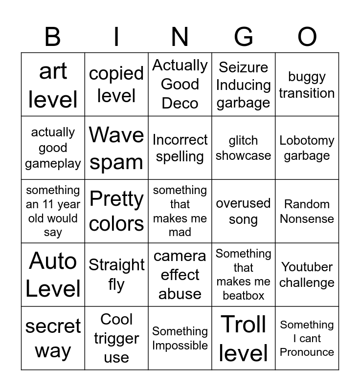 This bingo card has a free space and 24 words: Straight fly, Cool trigger use, Incorrect spelling, secret way, buggy transition, art level, actually good gameplay, copied level, overused song, camera effect abuse, glitch showcase, something an 11 year old would say, Something that makes me beatbox, Youtuber challenge, Wave spam, Troll level, Random Nonsense, Actually Good Deco, Lobotomy garbage, Pretty colors, Something I cant Pronounce, Auto Level, Seizure Inducing garbage and Something Impossible.