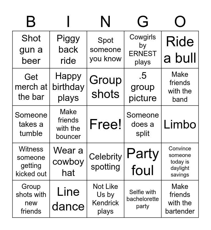 This bingo card has a free space and 24 words: Wear a cowboy hat, Line dance, Group shots, Group shots with new friends, Ride a bull, Shot gun a beer, Get merch at the bar, Piggy back ride, Someone does a split, Celebrity spotting, .5 group picture, Someone takes a tumble, Party foul, Convince someone today is daylight savings, Happy birthday plays, Selfie with bachelorette party, Limbo, Spot someone you know, Make friends with the band, Make friends with the bouncer, Make friends with the bartender, Witness someone getting kicked out, Cowgirls by ERNEST plays and Not Like Us by Kendrick plays.