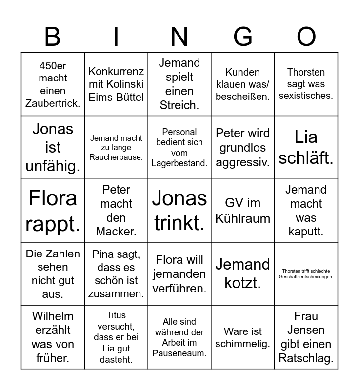 This bingo card has 25 words: Pina sagt, dass es schön ist zusammen., Alle sind während der Arbeit im Pauseneaum., Personal bedient sich vom Lagerbestand., Wilhelm erzählt was von früher., Thorsten sagt was sexistisches., 450er macht einen Zaubertrick., Jonas ist unfähig., Konkurrenz mit Kolinski Eims-Büttel, GV im Kühlraum, Flora will jemanden verführen., Peter wird grundlos aggressiv., Flora rappt., Jemand kotzt., Thorsten trifft schlechte Geschäftsentscheidungen., Jemand macht zu lange Raucherpause., Frau Jensen gibt einen Ratschlag., Jemand macht was kaputt., Jemand spielt einen Streich., Lia schläft., Peter macht den Macker., Jonas trinkt., Titus versucht, dass er bei Lia gut dasteht., Die Zahlen sehen nicht gut aus., Kunden klauen was/ bescheißen. and Ware ist schimmelig..