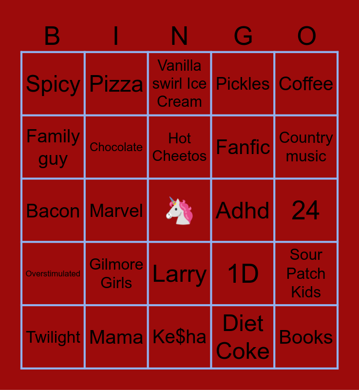 This bingo card has a free space and 24 words: Twilight, Gilmore Girls, Hot Cheetos, Diet Coke, Coffee, Spicy, Pizza, Vanilla swirl Ice Cream, Adhd, 24, Bacon, Chocolate, 1D, Sour Patch Kids, Family guy, Mama, Ke$ha, Pickles, Country music, Overstimulated, Marvel, Larry, Fanfic and Books.