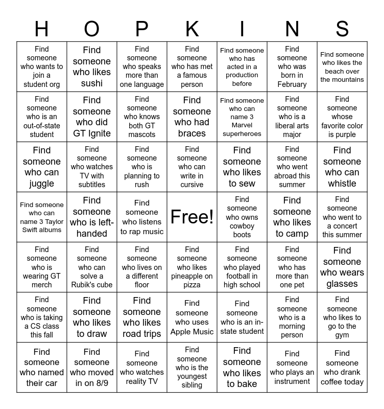 This bingo card has a free space and 48 words: Find someone who is an in-state student, Find someone who is a liberal arts major, Find someone who is the youngest sibling, Find someone who is left-handed, Find someone who is planning to rush, Find someone who went to a concert this summer, Find someone who likes sushi, Find someone who moved in on 8/9, Find someone who was born in February, Find someone who likes pineapple on pizza, Find someone who likes the beach over the mountains, Find someone who has met a famous person, Find someone who went abroad this summer, Find someone who likes to sew, Find someone who is taking a CS class this fall, Find someone who likes to camp, Find someone who is an out-of-state student, Find someone whose favorite color is purple, Find someone who is a morning person, Find someone who has acted in a production before, Find someone who can name 3 Marvel superheroes, Find someone who listens to rap music, Find someone who wants to join a student org, Find someone who did GT Ignite, Find someone who likes to go to the gym, Find someone who knows both GT mascots, Find someone who can whistle, Find someone who named their car, Find someone who can write in cursive, Find someone who watches TV with subtitles, Find someone who plays an instrument, Find someone who owns cowboy boots, Find someone who wears glasses, Find someone who likes to draw, Find someone who can name 3 Taylor Swift albums, Find someone who played football in high school, Find someone who has more than one pet, Find someone who can juggle, Find someone who lives on a different floor, Find someone who likes road trips, Find someone who is wearing GT merch, Find someone who drank coffee today, Find someone who speaks more than one language, Find someone who watches reality TV, Find someone who had braces, Find someone who uses Apple Music, Find someone who can solve a Rubik's cube and Find someone who likes to bake.
