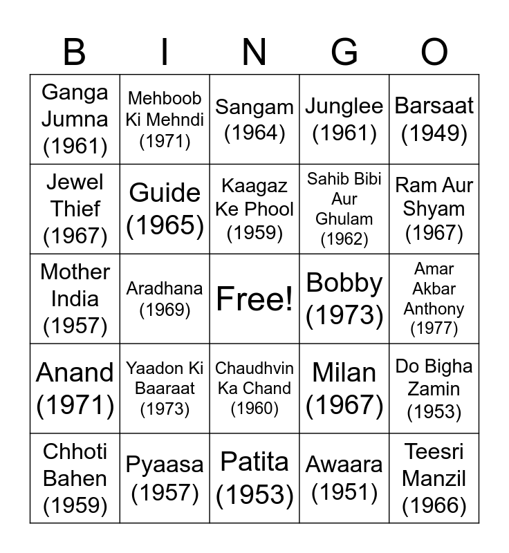 This bingo card has a free space and 40 words: Shree 420 (1955), Mother India (1957), Mughal-e-Azam (1960), Guide (1965), Pyaasa (1957), Chaudhvin Ka Chand (1960), Kaagaz Ke Phool (1959), Chori Chori (1956), Barsaat (1949), Anand (1971), Aradhana (1969), Junglee (1961), Teesri Manzil (1966), Amar Akbar Anthony (1977), Bobby (1973), Yaadon Ki Baaraat (1973), Hare Rama Hare Krishna (1971), Ganga Jumna (1961), Kati Patang (1971), Sangam (1964), Do Bigha Zamin (1953), Awaara (1951), Sahib Bibi Aur Ghulam (1962), Jewel Thief (1967), Amar Prem (1972), Baiju Bawra (1952), Naya Daur (1957), Sujata (1959), Devdas (1955), Aandhi (1975), Sholay (1975), Chhoti Bahen (1959), Waqt (1965), Milan (1967), Ram Aur Shyam (1967), Patita (1953), Jis Desh Mein Ganga Behti Hai (1960), Johny Mera Naam (1970), Mehboob Ki Mehndi (1971) and Seeta Aur Geeta (1972).