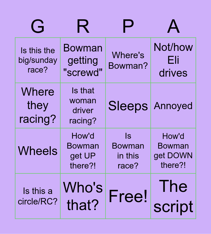 This bingo card has 16 words: Is this a circle/RC?, Who's that?, Where's Bowman?, Not/how Eli drives, Where they racing?, Bowman getting "screwd", Is Bowman in this race?, How'd Bowman get DOWN there?!, Is this the big/sunday race?, Is that woman driver racing?, Free!, Annoyed, Wheels, How'd Bowman get UP there?!, Sleeps and The script.