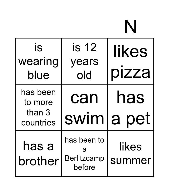This bingo card has a free space and 8 words: has a pet, likes pizza, is 12 years old, has a brother, is wearing blue, likes summer, has been to more than 3 countries and has been to a Berlitzcamp before.