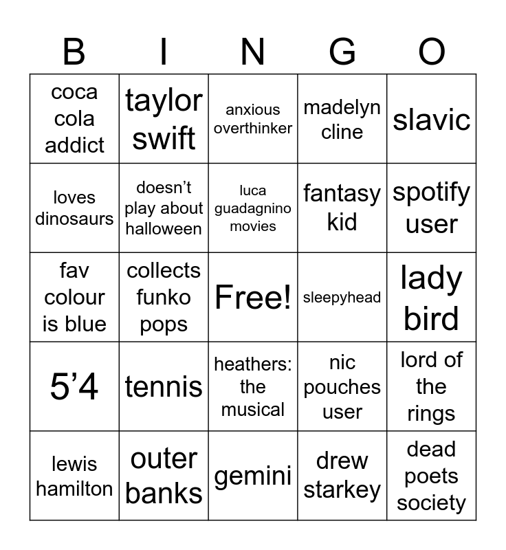 This bingo card has a free space and 24 words: tennis, outer banks, luca guadagnino movies, lewis hamilton, slavic, coca cola addict, loves dinosaurs, taylor swift, sleepyhead, heathers: the musical, fantasy kid, fav colour is blue, nic pouches user, lord of the rings, doesn’t play about halloween, drew starkey, lady bird, anxious overthinker, spotify user, collects funko pops, dead poets society, 5’4, madelyn cline and gemini.