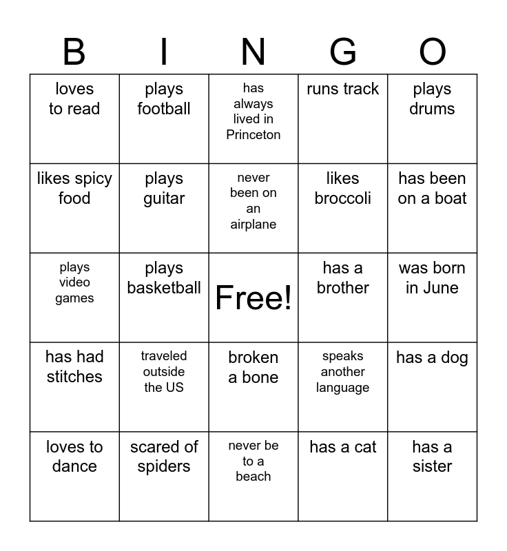 This bingo card has a free space and 24 words: traveled outside the US, scared of spiders, never been on an airplane, loves to dance, plays drums, loves to read, likes spicy food, plays football, has a brother, broken a bone, likes broccoli, plays video games, speaks another language, has a dog, plays guitar, has a cat, was born in June, has always lived in Princeton, has been on a boat, plays basketball, has a sister, has had stitches, runs track and never be to a beach.